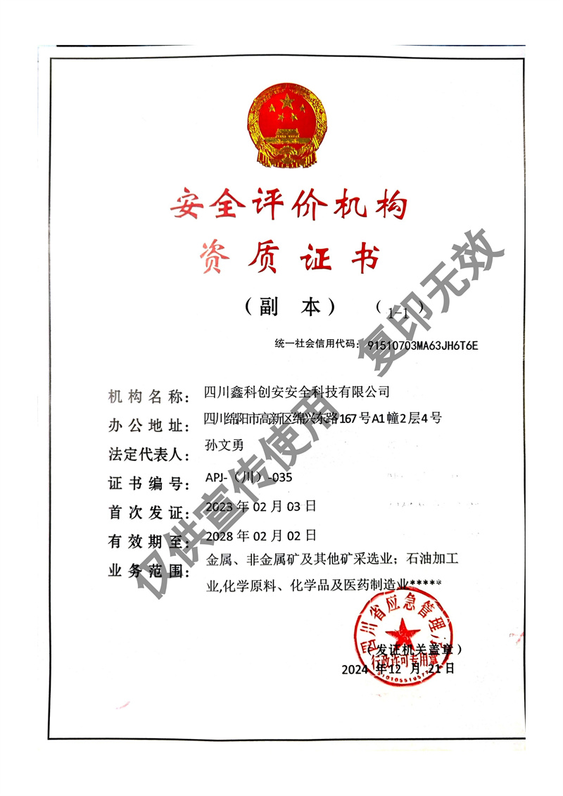四川鑫科創(chuàng)安安全科技有限公司成立于2020年,是川北地區(qū)取得資質(zhì)的民營安全評價機構(gòu)(資質(zhì)證書編號:APJ-(川)-035)。并于2022年牽頭成立綜合應急救援隊伍 - 綿陽曙光應急救援中心。